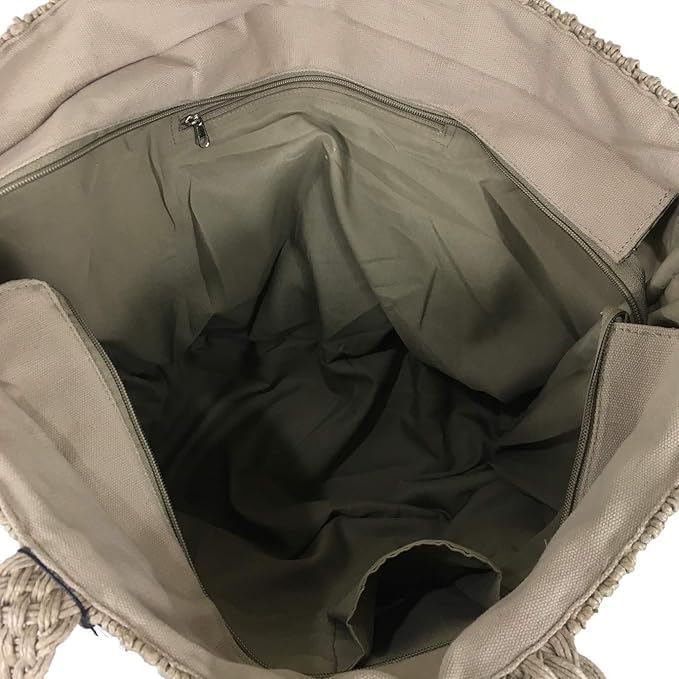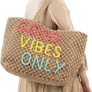 Alex Max Extra Large Woven Straw Beach Tote Bag – Natural Beige Macrame Handbag with “Good Vibes Only” Text – Oversized Summer Beach Tote for Women