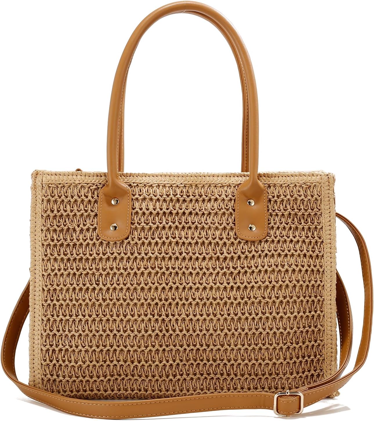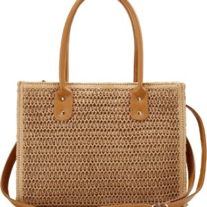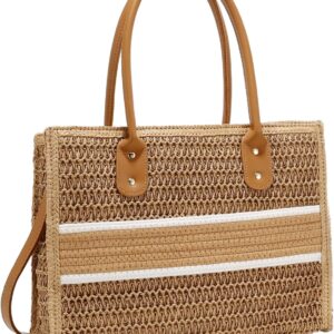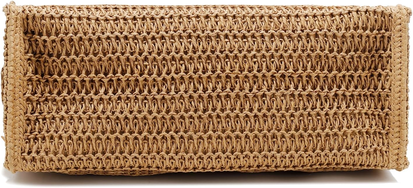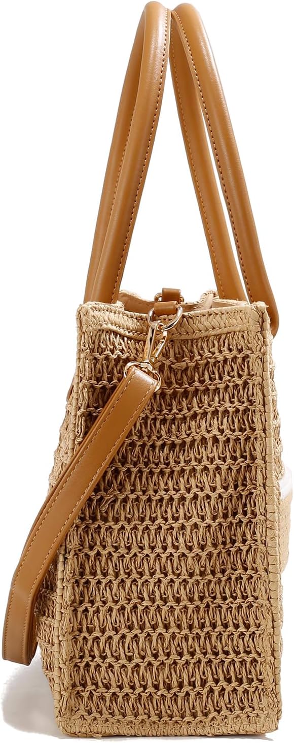 E Straw Beach Bag, Large Tote Bag for Women Summer Woven Straw Shoulder Hangbag with Adjustable Strap