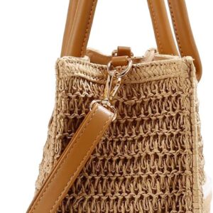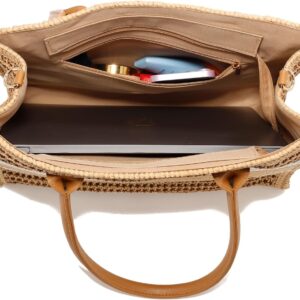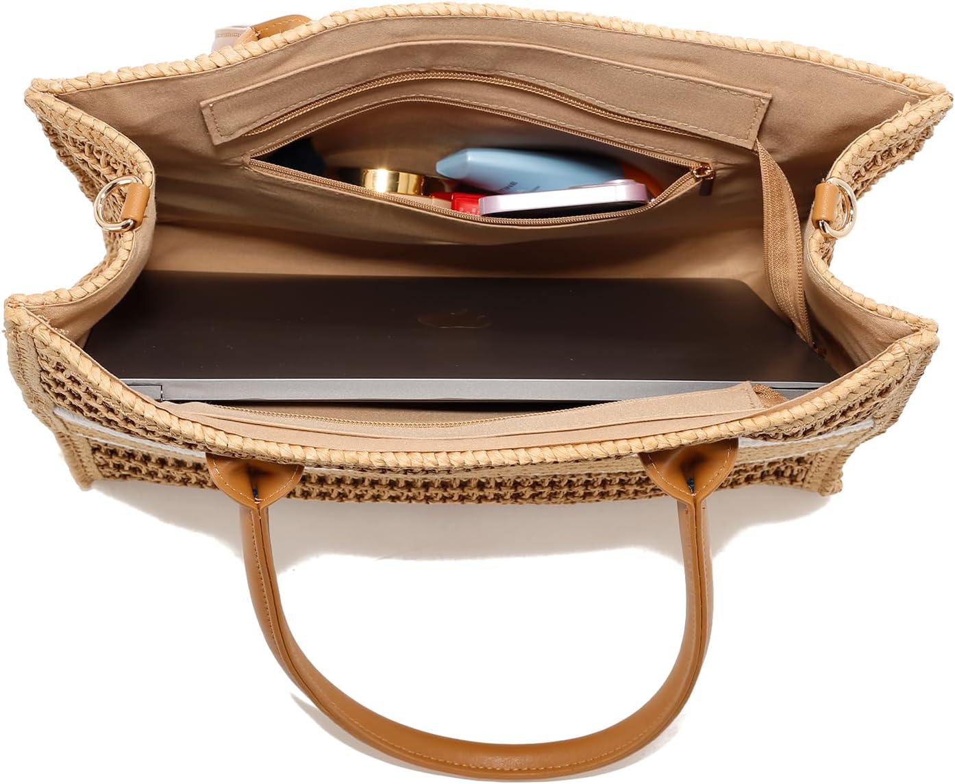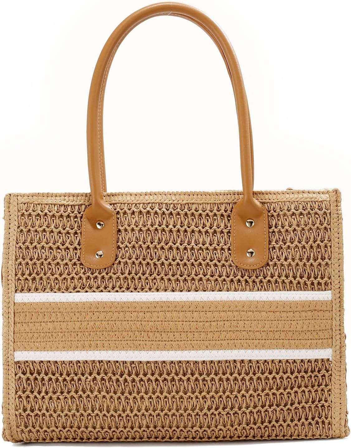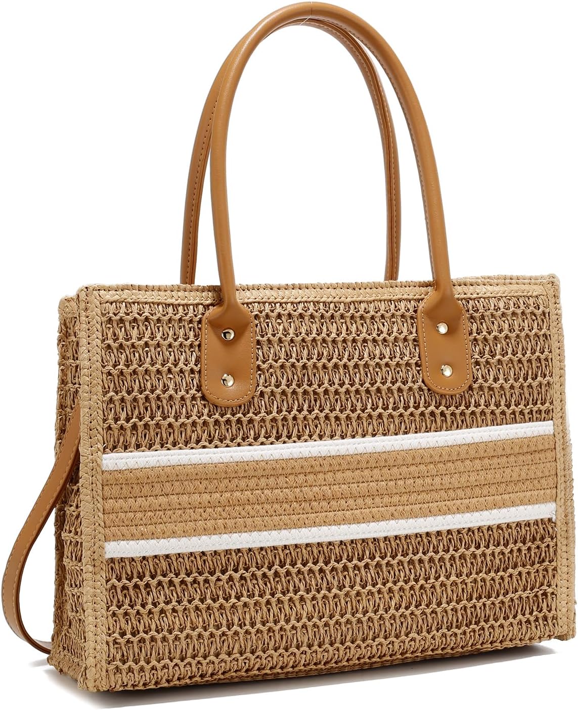 E Straw Beach Bag, Large Tote Bag for Women Summer Woven Straw Shoulder Hangbag with Adjustable Strap