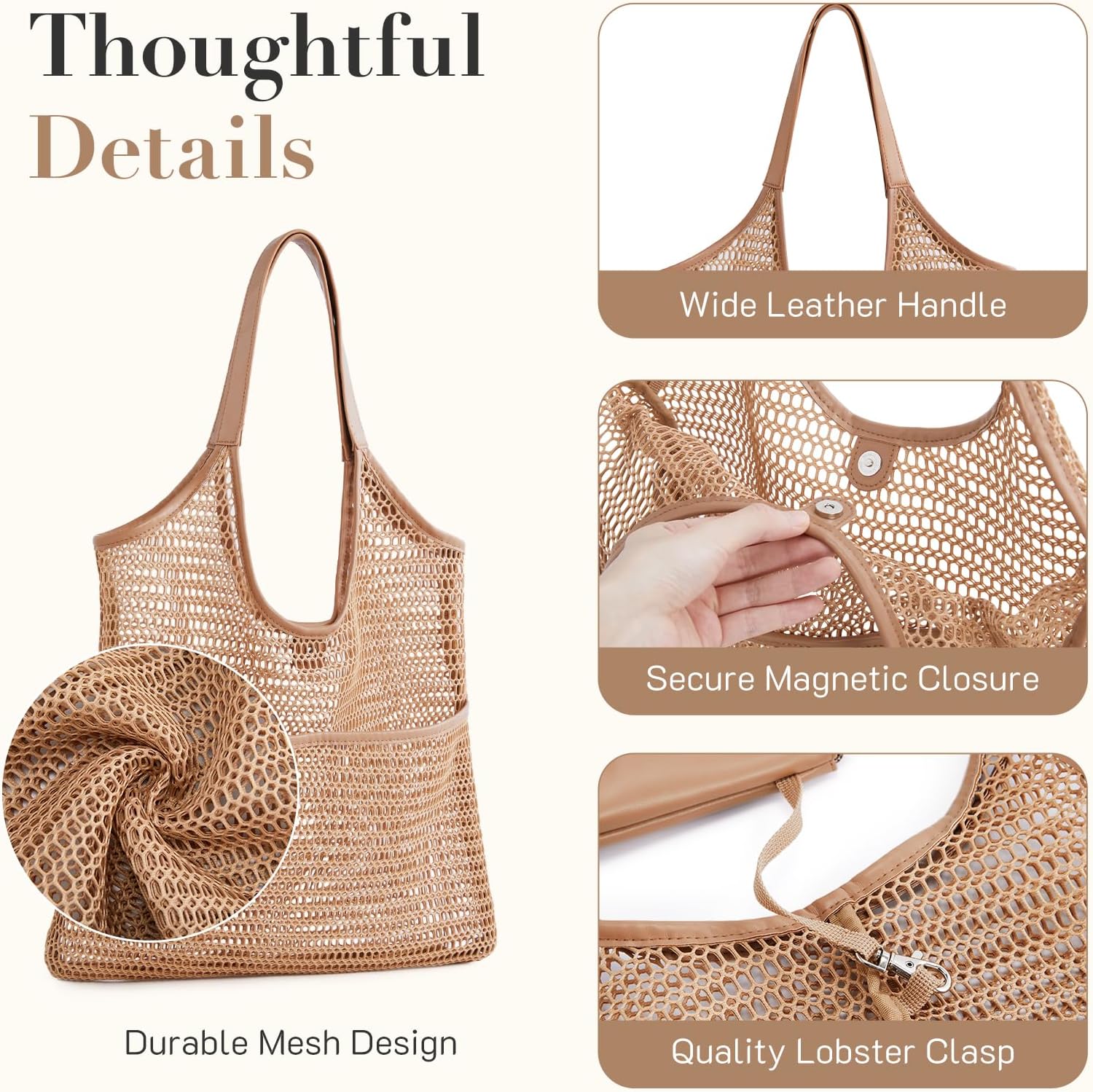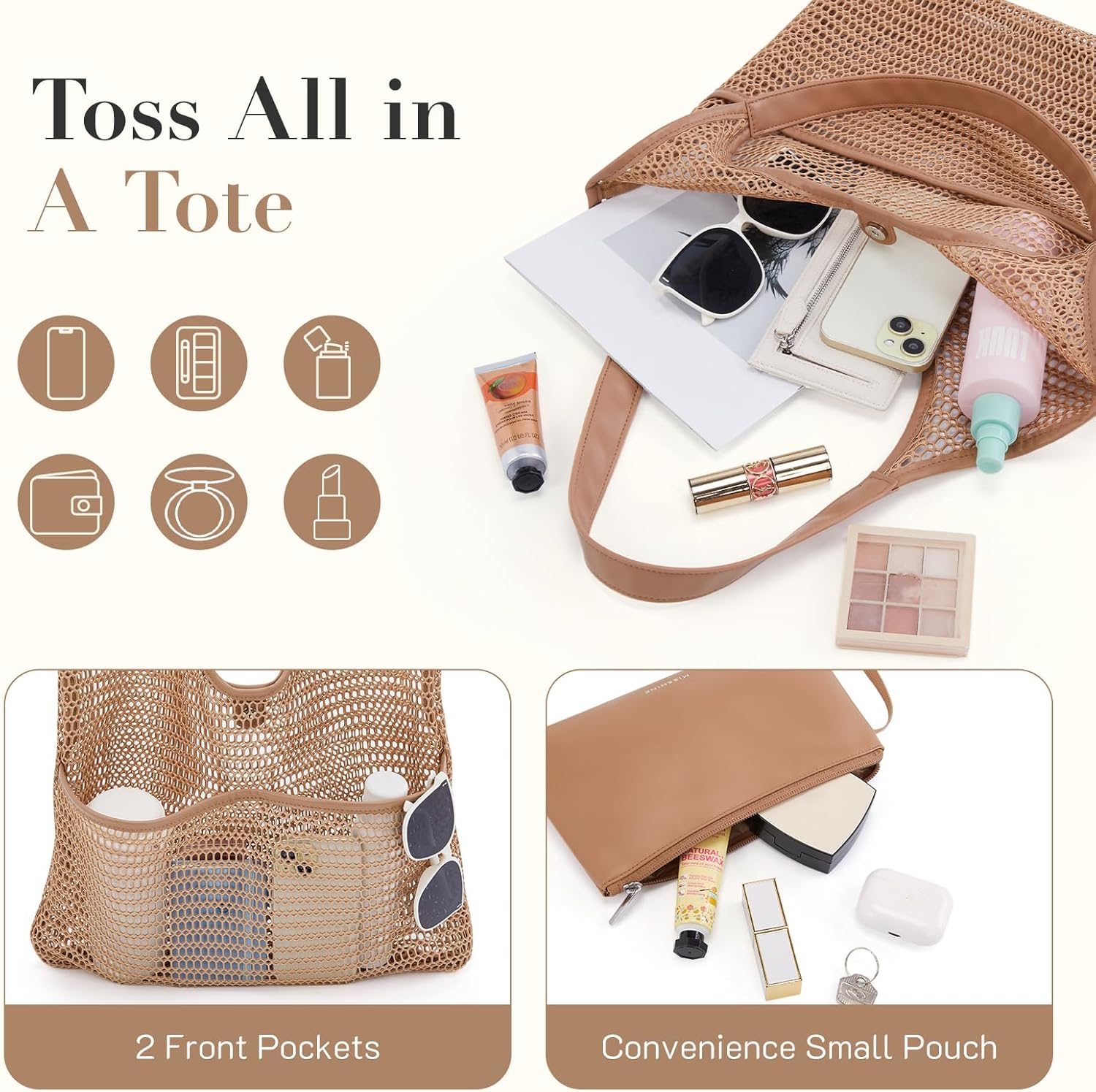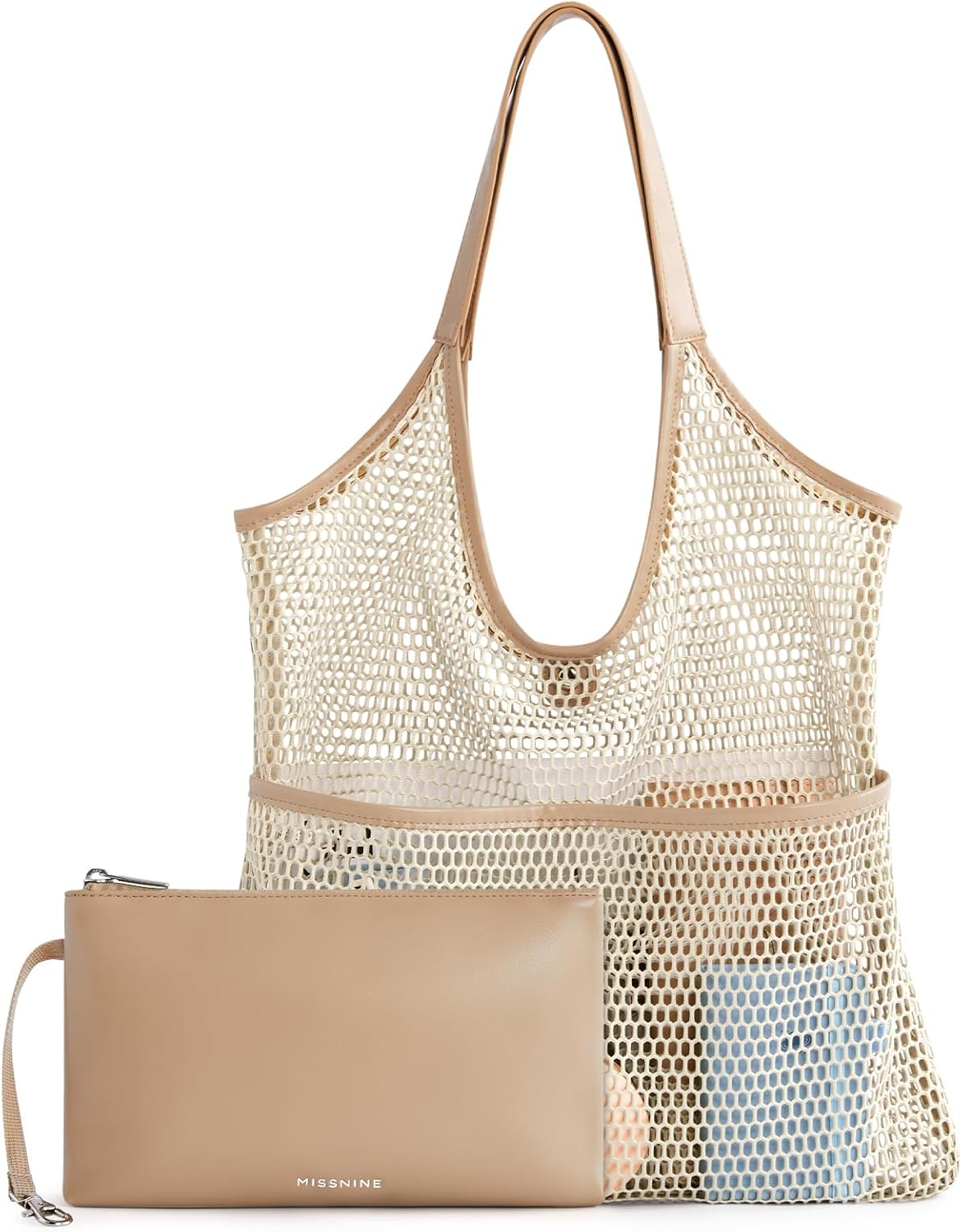 Missnie Women Mesh Beach Bag – Sandproof Foldable Summer Tote Leather Hobo Purse with Pouch for Vacation, Travel Essentials