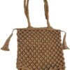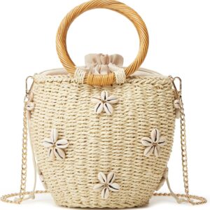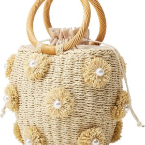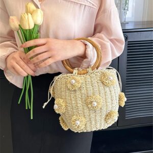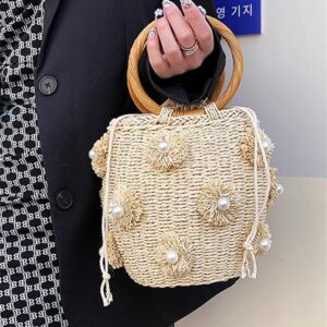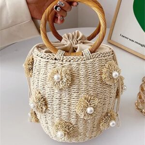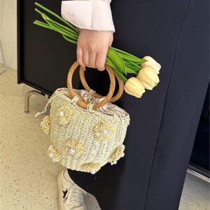 Summer Straw Bag for Women Pearl Flower Bucket Tote Bag Diamond Handbag Hand Woven Rattan Shell Purse Drawstring
