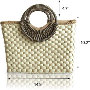 Women Summer Retro Straw Bag with Zip Hand-woven Beach Handbag Top Round Handle Boho Tote Bag Shopping and Travel Large Bag (Beige)
